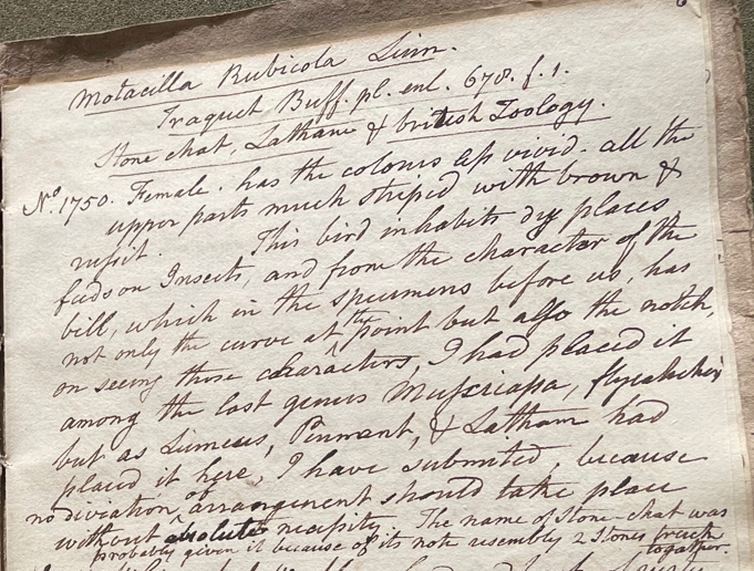 Peale continued: "No. 1750. Female. has the colours less vivid. All the upper parts much striped with brown & russet. This bird inhabits dry places, feeds on Insects, and from the character of the bill, which in the specimens before us, has not only the curve at the point but also the notch; on seeing those characters, I had placed it among the last genus Muscicapa, flycatchers, but as Linnaeus, Pennant, & Latham had placed it here [in Motacilla], I have submitted because no diviation of arrangement should take place without absolute necessity. The name of Stone-Chat was probably given it because of its note [resembling] 2 stones struck together." (ANSP Archives, coll. 40)