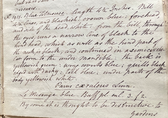 Charles Willson Peale (1741-1827) wrote, in his 37th Lecture (ca. 1799): "No. 1911. Blue Titmouse. Length 4 ½ Inches. Bill 4 ½ lines and blackish; crown blue; forehead, and side of the head, white; from the bill, through the eyes, runs a narrow line of black to the hind head, which as well as the hind part of the neck, is black, and continued in a semicircular form to the under mandible; the back is yellowish green; wing coverts blue; quills black edged with dusky; tail blue; under parts of the body yellowish white. Parus caeruleus Linn. Le Mesange blue. Buff. pl. enl. 3. f. 2." (Academy of Natural Sciences of Drexel University Archives, coll. 40)