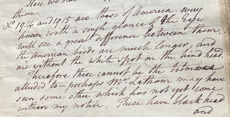 Charles Willson Peale (1741-1827) wrote, in his 37th Lecture (ca. 1799): "Here we have the opportunity of comparing [Coal Tit, Periparus ater with the American species] … No. 1914 and 1915 are those of America; every person with a single glance of the eye will see a great difference between them. The American birds are much longer, and are without the white spot on the hind head. Therefore these cannot be the titmice alluded to. Perhaps Mr. Latham may have seen some other which has not yet come within my notice. These have [a] black head and throat; cheeks & breast white, not of the dingy colour of the Cole Titmous No. 1913; the back, wings & tail cinerious." (Academy of Natural Sciences of Drexel University Archives, coll. 40)