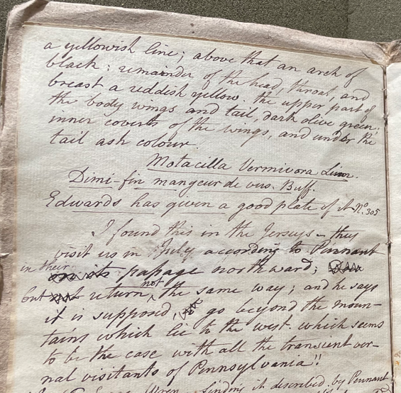 Charles Willson Peale (1741-1827) wrote, in his 36th Lecture (ca. 1799): "No. 1764. Worm Eater Warbler, from the bill through the Eye a narrow black line; just above the Eye a yellowish line; above that an arch of black; remainder of the head, throat, and breast a reddish yellow. The upper part of the body, wings and tail, dark olive green; inner coverts of the wings, and under the tail ash colour. Motacilla vermivore Linn. Dimi-fin mangeur de vers. Buff. Edwards has given a good plate of it. No. 305. I found this [specimen] in the Jerseys. They visit us in July according to Pennant, in their passage northward; but return not the same way; and he says it is supposed to go beyond the mountains which lie to the west, which seems to be the case with all the transient vernal visitants of Pennsylvania."(Academy of Natural Sciences of Drexel University Archives, coll. 40)