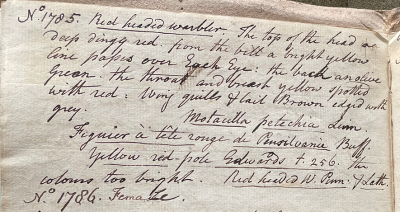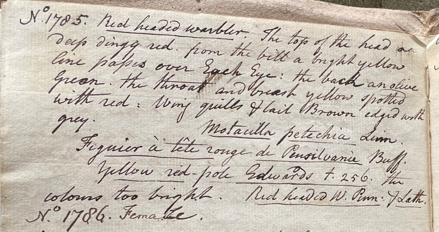 Charles Willson Peale (1741-1827) wrote, in his 36th Lecture (ca. 1799): "No. 1785. Red headed Warbler. The top of the head a deep dingy red; from the bill a bright yellow line passes over each Eye; the back an olive green; the throat and breast yellow spotted with red; wing quills & tail Brown edged with grey. Motacilla petechia Linn. Figuier à tête trouge de Pensilvanie Buff. Yellow red-pole Edwards t. 256. The colours too bright. Red headed W. Penn. & Lath. No. 1786. Female." (Academy of Natural Sciences of Drexel University Archives, coll. 40)