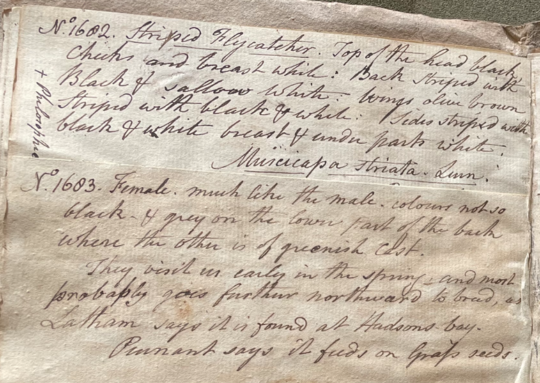 Peale wrote, in "A Walk Through the Philad[elphi]a Museum" (1805–1806): "Striped flycatcher (M. Striata). not very common, it is found in the thick woods." (Historical Society of Pennsylvania, coll. 0481)