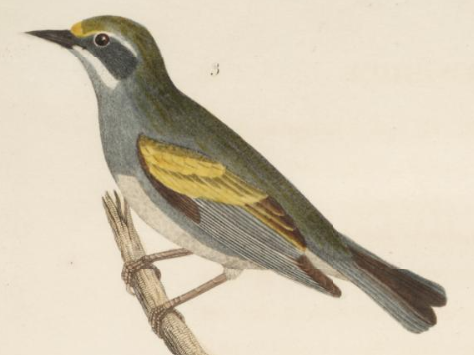 Charles Willson Peale (1741-1827) wrote, in his 36th Lecture (ca. 1799): "No. 1772. Golden Winged Warbler. The top of the head is a fine yellow; a broad bar of black surrounds the Eyes; a line of white above and another below the black; the throat and lower part of the neck black; a large spot of gold colour on the superior coverts of the wings; the upper parts of the body of a lead colour; and the breast white. Motacilla chrysoptera Linn. Figuier aux ails dorées Buff. Golden Winged Flycatcher Edwards glean. t. 299. Golden Winged Warbler. Penn. & Lath. This species is also found with us in the spring only: going to the northward to breed." (Academy of Natural Sciences of Drexel University Archives, coll. 40)