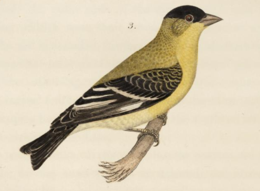 Charles Lucien Bonaparte (1803–57) described this species under the name "Arkansaw Siskin / Fringilla psaltria" in his continuation of American Ornithology vol. 1 (1825, Pl. 6). Bonaparte (1825: 54) cited "Peale's Museum, No. 6278" and wrote: "The only specimen brought by the party, was shot on the sixteenth of July, near Boiling Spring creek." / https://search.library.wisc.edu/digital/AFKPEJIASN54OC8L/pages/ACM7ZLVH… (text) / https://search.library.wisc.edu/digital/AFKPEJIASN54OC8L/pages/AFOZCVAW… (plate)