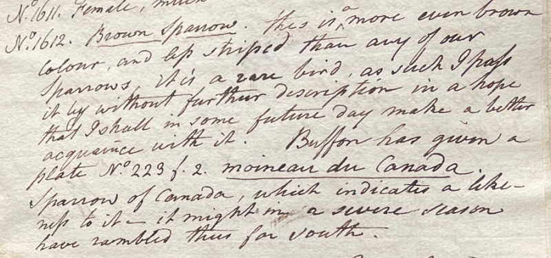 Charles Willson Peale (1741-1827) wrote, in his 34th Lecture (ca. 1799): "No. 1612. Brown Sparrow. This is a more even brown colour, and less striped than any of our sparrows. It is a rare bird, as such I pass it by without further description in a hope that I shall in some future day make a better acquaince [sic] with it. Buffon has given a plate No. 223 f. 2. Moineau du Canada. Sparrow of Canada, which indicates a likeness to it. It might in a severe season have rambled thus far south." (Academy of Natural Sciences of Drexel University Archives, coll. 40)