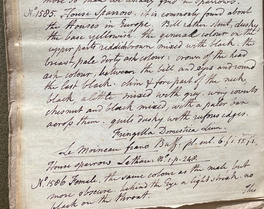 Charles Willson Peale (1741-1827) wrote, in his 34th Lecture (ca. 1799): "No. 1585. House Sparrow. It is commonly found about the Houses in Europe. Bill rather stout, dusky, the base yellowish. The general colour on the upper parts reddish brown mixed with black. The breast, pale dirty ash colour; crown of the head ash colour; between the bill and eyes and round the last black; chin & fore part of the neck, black, a little mixed with grey; wing coverts chesnut and black mixed with a paler bar across them; quils dusky with rufous edges. Fringilla domestica Linn. Le Moineau Franc Buff. pl. enl. 6. f. 1. young 55. f. 1. House Sparrow Latham No. 1. p. 248." (Academy of Natural Sciences of Drexel University Archives, coll. 40)
