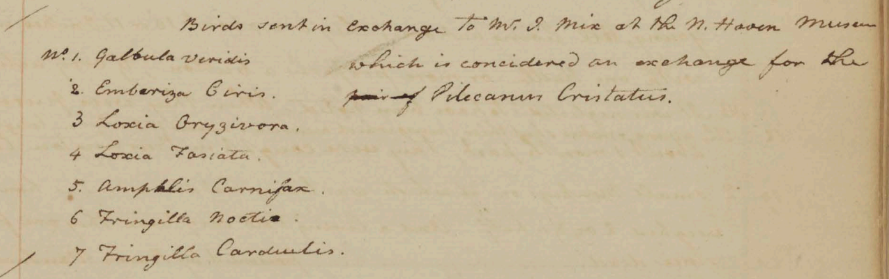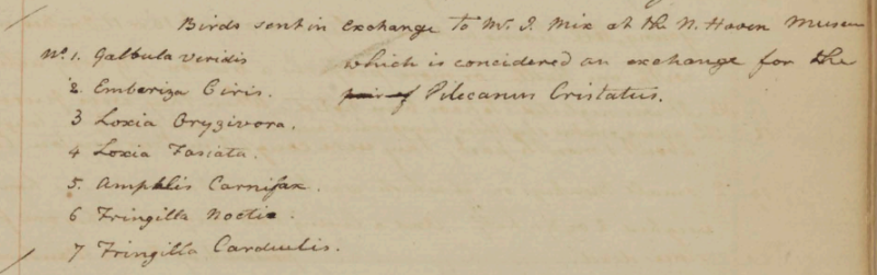 Peale sent seven birds “in Exchange to Mr. J. Mix at the N. Haven Museum which is considered an exchange for the Pilecanus Cristatus.” John Mix (1751-1820) was a museum proprietor and author of A catalogue of a part of the curiosities, both natural and artificial, contained in the museum in New-Haven. Collected, preserved and arranged, by John Mix, of New-Haven, Connecticut, proprietor of the museum (New Haven, 1812). The year after his death, much of Mix's museum was acquired by the New-England Museum (1818-ca. 1838) in Boston. See also Christine DeLucia, "Fugitive Collections in New England Indian Country: Indigenous Material Culture and Early American History Making at Ezra Stiles's Yale Museum," William & Mary Quarterly, 3d ser. 75, no. 1 (Jan 2018): 143-145.