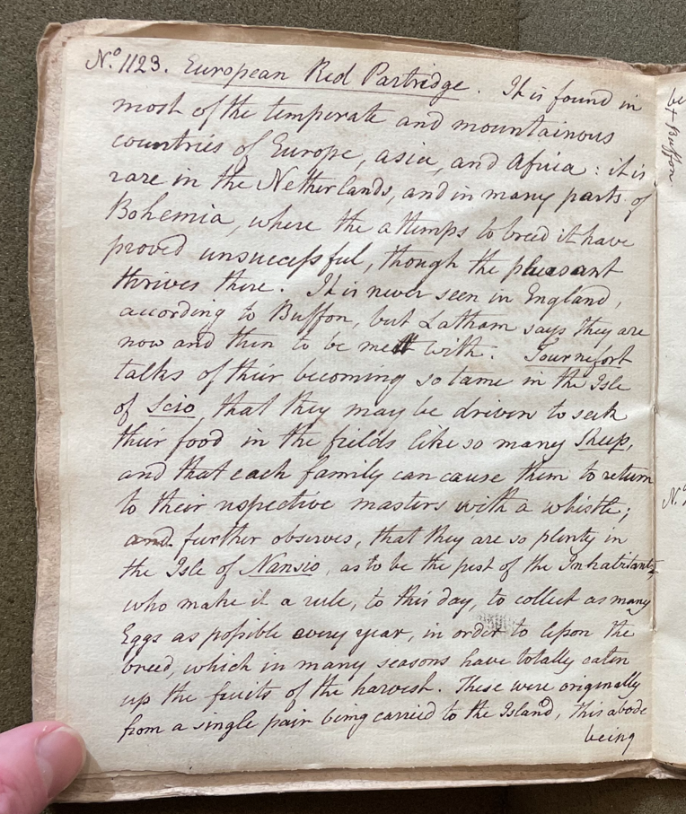 Charles Willson Peale (1741-1827) wrote, in his 30th Lecture (ca. 1799): "No. 1123. Red Partridge. It is found in most of the temperate and mountainous countries of Europe, Asia, and Africa. It is rare in the Netherlands, and in many parts of Bohemia, where the attempts to breed it have proved unsuccessful, though the pheasant thrives there. It is never seen in England, according to Buffon, but Latham says they are now and then to be met with. Tournefort talks of their becoming so tame in the Isle of Scio [Chios, Greece] that they may be driven to seek their food in the fields like so many sheep, and that each family can cause them to return to their respective masters with a whistle; and further observes, that they are so plenty in the Isle of [Nansio] as to be the pest of the inhabitants, who make it a rule, to this day, to collect as many eggs as possible every year, in order to lessen the breed, which in many seasons have totally eaten up the fruits of the harvest." (Academy of Natural Sciences of Drexel University Archives, coll. 40)