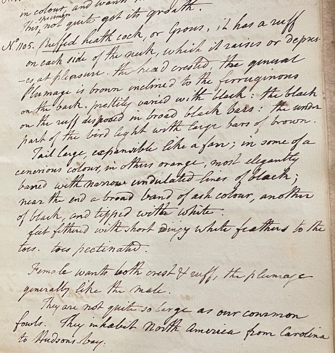 Charles Willson Peale (1741-1827) wrote, in his 29th Lecture (ca. 1799): "No. 1105. Ruffed heath cock, or Grous. It has a ruff on each side of the neck, which it raises or depresses at pleasure; the head crested; the general plumage is brown inclined to the ferruginous on the back, prettily varies with black; the black on the ruff [dispersed] in broad black bars; the under part of the bird light with large bars of brown; tail large, expansible like a fan; in some of a cenerious colour, in others range, most elegantly barred with narrow undulated lines of black; near the end a broad band of ash colour, another of black and tipped with white; feet feathered with short dingy white feathers to the toes; toes pectinated. Female wants both crest & ruff, the plumage generally like the male. They are not quite so large as our common fowls. They inhabit North America from Carolina to Hudsons Bay." (Academy of Natural Sciences of Drexel University Archives, coll. 40)