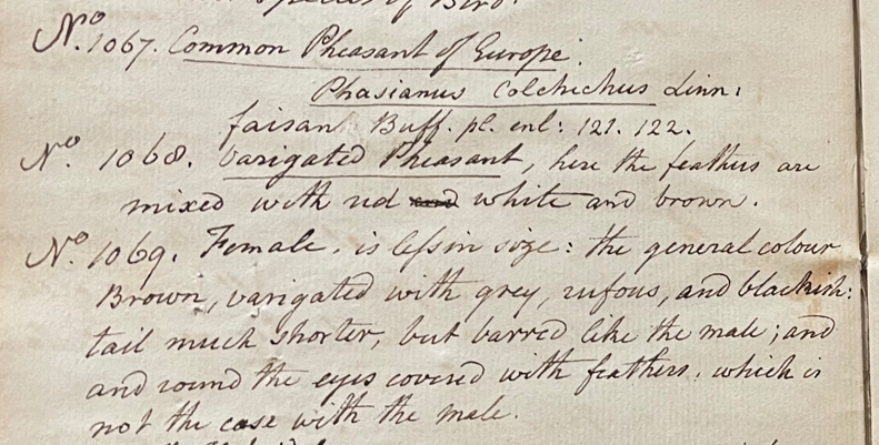 In his 29th Lecture (ca. 1799), Peale described several pheasants including hybrids and domestic varieties: "No. 1067. Common Pheasant of Europe. Phasianus colchichus Linn. Faisan Buff. pl. enl. 121. 122. No. 1068. Varigated Pheasant. Here the feathers are mixed with red, white and brown. No. 1069. Female, is less in size; the general colour brown, varigated with grey, rufous, and blackish; tail much shorter, but barred like the male; and round the eyes covered with feathers, which is not the case with the male … No. 1071. Ring Pheasant. This differs from No. 1067 in having a ring of pure white partly round its neck; the plumage is throught brighter in this species than the other, and the feathers on the lower part of the neck are more deeply indented, each feather appearing double at the ends." (Academy of Natural Sciences of Drexel University Archives, coll. 40)