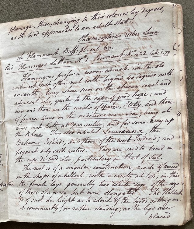 Peale continued: "No. 716. Most probably is at this age, it is less …] & in the third, a general glowing scarlet manifests itself throughout; the bill and the feet also keep pace with the gradation in the plumage, these, changing to their colours by degrees, as the bird approaches to an adult state. Phoenicopteras ruber Linn. Le Flammant. Buff. pl. enl. 63. Red Flamingo Latham No. 1. Pennant No. 422. Cat. i. 73. Flamingoes prefer a warm climate; in the old continent not often met with beyond 40 degrees north or south. Every where sun on the African coast and adjacent isles, quite to the Cape of Good Hope; and now and then on the coasts of Spain, Itally, and those of France […] in theMediterranean Sea; being at times met with at Marseilles, and for some way up the Rhone. They also inhabit Louisiana, the Bahama Islands, and those of the West India's [sic]; and frequent only salt waters. They are said to breed in the Cape de Verd Isles, particularly in that of Sal. The nest is of a singular construction, made of mud, in the shape of a hillock, with a cavity at top; in this the female lays generally two white eggs, of the size of those of a goose, but more elongated. The Hillock is of such an height as to admit of the bird's sitting on it conveniently, or rather standing; as the legs are placed one on each side at full length. The young cannot fly till full grown, but run very fast." (ANSP Archives, coll. 40)