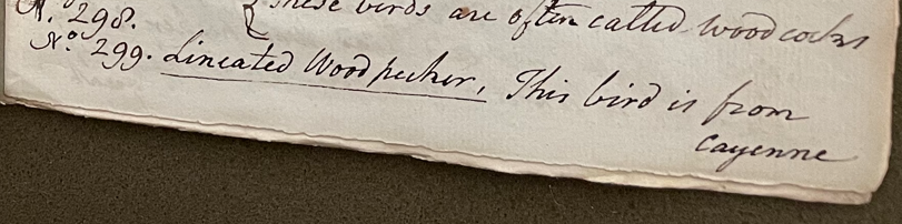 Charles Willson Peale (1741-1827) wrote, in his 19th Lecture (ca. 1799): "No. 299. Lineated Woodpecker. This bird is from Cayenne; it is considerably like those of North America except that the belly is of a dingy white, striated transversely with black. It measures about 18 Inches in length." (Academy of Natural Sciences of Drexel University Archives, coll. 40)