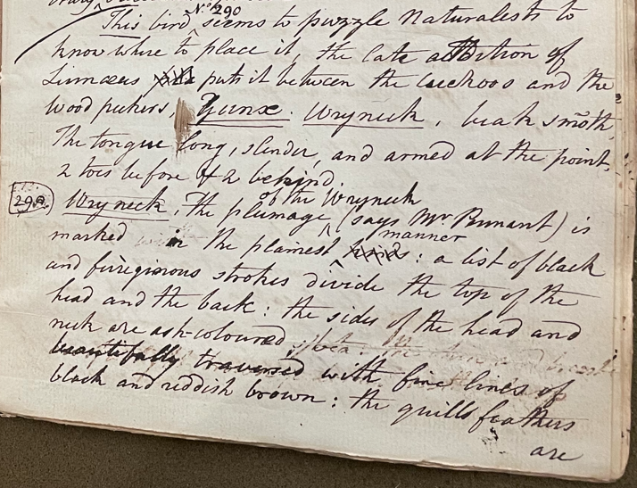 Peale wrote, in "A Walk Through the Philad[elphi]a Museum" (1805–1806): "The next is a small difference from woodpeckers, in a genus termed Yunx [sic]. Called Wryneck, from their perpetually twisting its neck round and looking about. They agree with woodpeckers by having a tongue worm shaped and armed at the point, and feet for climbing — and they also feed on the larva of Insects and Ants — but their tail is compozed of 10 Soft feathers — whereas Woodpeckers tails are rigid & sharp pointed, very useful to them while pecking the holes in trees. Wrynecks inhabit Europe, Asia & Africa." (Historical Society of Pennsylvania, coll. 0481)
