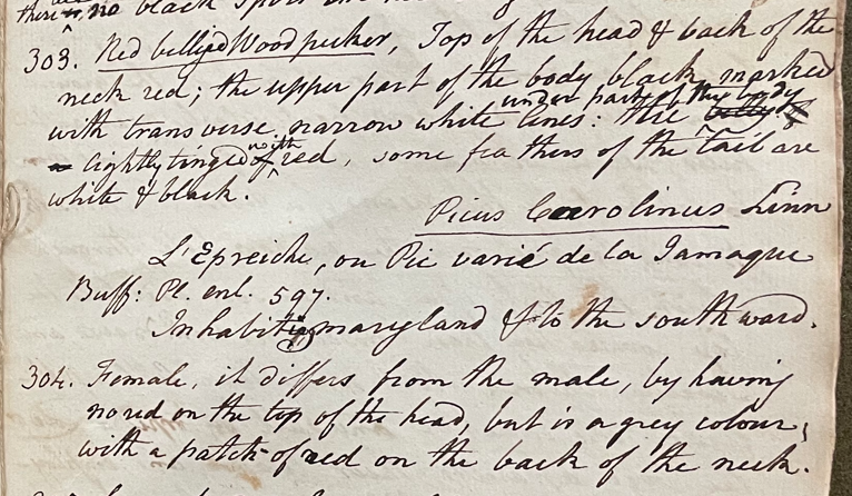 Charles Willson Peale (1741-1827) wrote, in his 19th Lecture (ca. 1799): "303. Red bellyed Woodpecker. Top of the head & back of the neck red; the upper part of the body black marked with transverse narrow white lines; the belly under parts of the body lightly tinged with red, some feathers of the tail are white & black. Picus carolinus Linn. L'Epreiche, ou Pic varié de la Jamaque Buff. pl. enl. 597. Inhabits Maryland & to the southward. 304. Female, it differs from the male, by having no red on the top of the head, but is a greay colour, with a patch of red on the back of the neck." (Academy of Natural Sciences of Drexel University Archives, coll. 40)