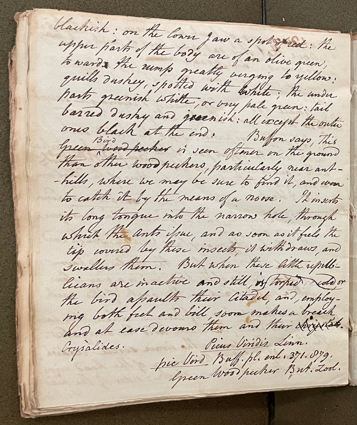 Peale wrote, in "A Walk Through the Philad[elphi]a Museum" (1805–1806): "Green Woodpecker (P. Viridis) inhabits Europe." (Historical Society of Pennsylvania, coll. 0481)