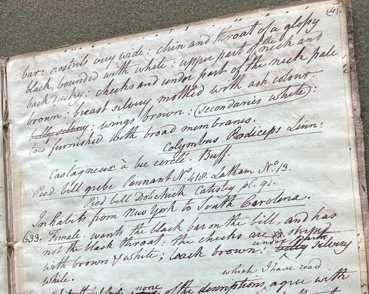 Peale wrote, in his 24th Lecture (ca. 1799): “632. Pied-bill Grebe. A strong arched bill, not unlike that of common Poultry; of an olive colour, crossed through the middle of both mandibles with a black bar; nostrils very wide; chin and throat of a glossy black, bounded with white; upper part of the neck and back dusky; cheeks and under part of the neck, pale brown; breast silvery mottled with ash colour; belly silvery; wings brown; secondaries white; toes furnished with broad membranes. Colymbus Podiceps Linn. Castagneux à bec circlé Buff. Pied bill grebe Pennant No. 418. Latham No. 13. Pied bill Doubchick Catesby pl. 91. Inhabits from New York to South Carolina. 633. Female. wants the black bar on the bill, and has not the black throat; the cheeks are striped with brown & white; back brown; belly under parts silver white.” (Academy of Natural Sciences of Drexel University Archives, coll. 40)