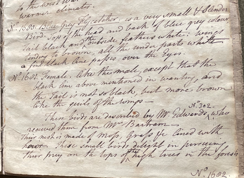 Charles Willson Peale (1741-1827) wrote, in his 35th Lecture (ca. 1799): "No. 1680. Blue Grey Flycatcher. is a very small & slender Bird. Top of the head and back of blue grey colour. Tail black and the outside feathers white; wings tending to brown, all the under parts white. a fine black line passes over the Eyes. No. 1681. Female. like the male, except that the black line above mentioned is wanting, and the Tail is not so black, but more brown like the quils of the wings. These birds are described by Mr. Edwards No. 302, who received them from Mr. [William] Bartram. Their nest is made of moss, grass & lined wth hair. These small birds delight in pursuing their prey on the tops of the high trees in the forest." (Academy of Natural Sciences of Drexel University Archives, coll. 40)