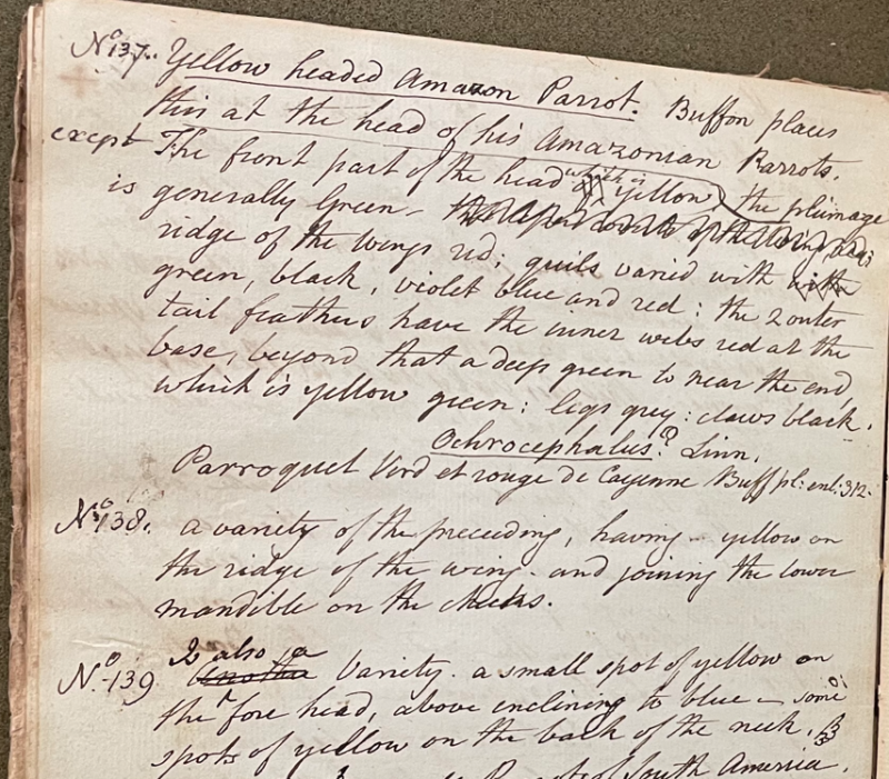 Charles Willson Peale (1741-1827) wrote, in his 16th Lecture (ca. 1799): "Yellow headed Amazon Parrot. Buffon places this at the head of his Amazonian Parrots. Except the front part of the head which is yellow, the plumage is generally green; ridge of the wings red; quils varied with green, black, violet blue and red; the 2 outer tail feathers have the inner webs red at the base, beyond that a deep green to near the end, which is yellow green; legs grey; claws black. Ochrocephalus? Linn. Parroquet Verd et rouge de Cayenne Buff. pl. enl. 312. Peale also described "No. 138. a variety of the preceeding, having yellow on the ridge of the wing and joining the lower mandible on the cheeks"; and "No. 139. is also a Variety. a small spot of yellow on the forehead, above inclining to blue, [and] some spots of yellow on the back of the neck … These are all Parrots of South America, and often brought to this country." (Academy of Natural Sciences of Drexel University Archives, coll. 40)