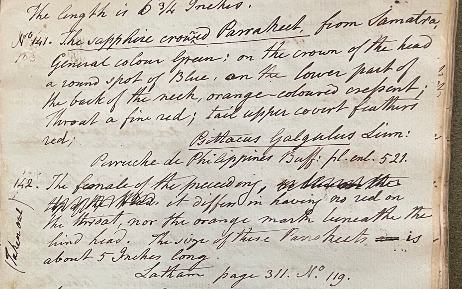 Charles Willson Peale (1741-1827) wrote, in his 16th Lecture (ca. 1799): "No. 141. The sapphire crowned Parrakeet. from Samatra [=Sumatra, Indonesia]. General colour green; on the crown of the head a round spot of Blue; on the lower part of the back of the neck, orange-coloured cressent; throat a fine red; tail upper covert feathers red. Psittacus galgulus Linn. Parruche de Philippines Buff. pl. enl. 520. No. 142. The female of the preceeding. it differs in having no red on the throat, nor the orange mark beneath the hind head. The size of these Parrakeets is about 5 Inches long. Latham page 311. No. 119. A note in the margin of the entry for the female reads: "(Taken out)." (Academy of Natural Sciences of Drexel University Archives, coll. 40)