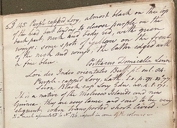 Charles Willson Peale (1741-1827) wrote, in his 16th Lecture (ca. 1799): "145. Purple Capped Lory. almost black on the top of the head but tending to clearer purple on the back part; neck and body red, with green wings; some psots of yellow on the front of the neck and wings, the latter edged with a fine blue. Psittacus Domicella Linn. Lori des Indes orientales Buff. pl. enl. 84. Purple-capped Lory, Lath. I. 2. p. 271. No. 77. Secon[d] Black cap Lory Edw. av. 4. t. 171 It is a native of the Molucca Islands and New Guinea. they are very tame, and said to be very eliquent, when transported short lived. It is much assimilated to No. 136 [i.e., Red Lory Eos bornea], except in some of the colours." (Academy of Natural Sciences of Drexel University Archives, coll. 40)