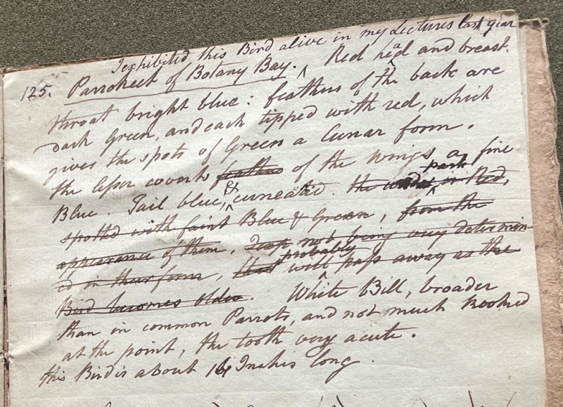 Charles Willson Peale (1741-1827) wrote, in his 15th Lecture (ca. 1799): "Parrakeet of Botany Bay. I exhibited this bird alive in my Lectures [last] year. Red head and breast; throat bright blue; feathers of the back are dark green, and each tipped with red, which gives the spots of green a lunar form. The lesser coverts of the wings a fine blue. Tail blue & cuneated. White bill, broader than in common Parrots, and not much hooked at the point, the tooth very acute. This bird is about 14 inches long." (Academy of Natural Sciences of Drexel University Archives, coll. 40)