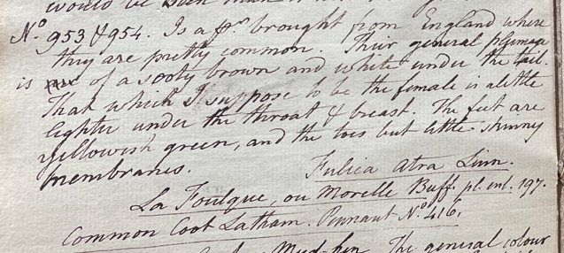 Charles Willson Peale (1741-1827) wrote, in his 27th Lecture (ca. 1799): "No. 953 & 954. Is a pr. Brought from England where they are pretty common. Their general plumage is of a sooty brown and white under the tail. That which I suppose to be the female is a little lighter under the throat & breast. The feet are yellowish green, and the toes but little skinny membranes. Fulica atra Linn. La Foulque, ou Morelle Buff. pl. enl. 197. Common Coot Latham. Pennant No. 416." (Academy of Natural Sciences of Drexel University Archives, coll. 40)