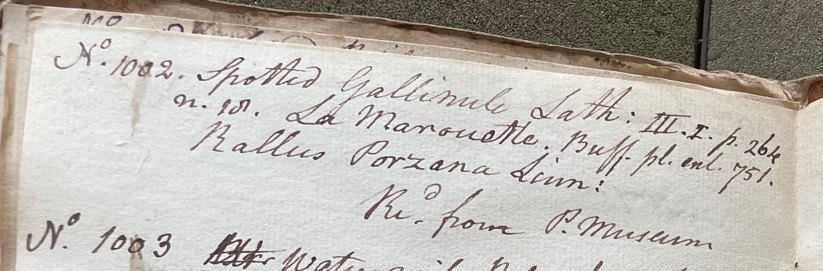 In his 27th Lecture, Charles Willson Peale (1741-1827) listed "No. 1002. Spotted Gallinule Lath. III. I. p. 264. No. 18. La Marouette. Buff. pl. enl. 751. Rallus Porzana Linn. Recd. from P[aris]. Museum." (Academy of Natural Sciences of Drexel University Archives, coll. 40)