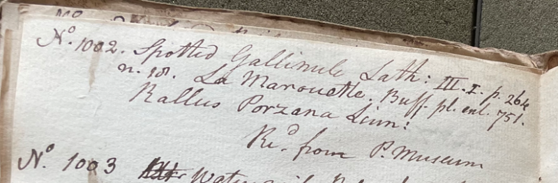 In "A Walk Through the Philad[elphi]a Museum" (1805–1806), Peale mentioned the "The Spotted Gallinule (R. Porzana) from Europe." (Historical Society of Pennsylvania, coll. 0481)