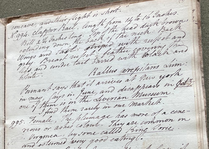 In "A Walk Through the Philad[elphi]a Museum" (1805–1806), Peale distinguished three species of North American rails: "The Clapper Rail (R. crepitans) is the largest species — this and the land [rail] and water rail are all we have belonging to N. America." (Historical Society of Pennsylvania, coll. 0481)