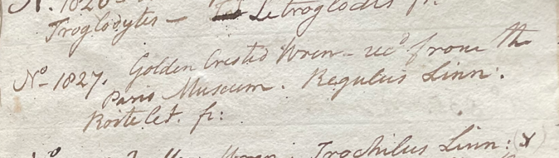 Charles Willson Peale (1741-1827) wrote, in his 36th Lecture (ca. 1799): "No. 1827. Golden Crested Wren recd from the Paris Museum. Regulus Linn. Roitelet fr." (Academy of Natural Sciences of Drexel University Archives, coll. 40)