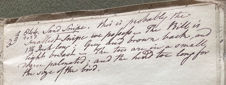 Charles Willson Peale (1741-1827) wrote, in his 26th Lecture (ca. 1799): "844. 4023. Sand snipe. This is probably the smallest snipe we possess. The Bill is 1 ¼ Inch long; grey and brown back, and light breast; the toes are in a small degree palmated; and the hind toe long for the size of the bird … 875. Little Sandpiper. Bill ¾ of an Inch long; the toes slightly connected at the base & the hind toe very small. Therefore I have placed it in this genus. The back and upper parts are brown & grey and the light…" (Academy of Natural Sciences of Drexel University Archives, coll. 40)