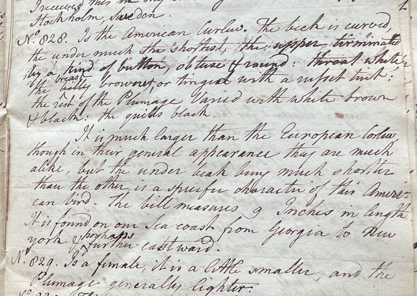 Charles Willson Peale (1741-1827) wrote, in his 26th Lecture (ca. 1799): "No. 828. Is the American Curlew. The beak is curved, the under much the shortest; the upper terminated by kind of button; obtuse & round; throat white, the breast & belly brown; or tinged with a russet tint; the rest of the plumage varied with white brown & black; the quills black. It is much larger than the European Curlew, though in their general appearance they are much alike, but the under beak being much shorter than the other is a specific character of this American bird. The bill measures 9 Inches in length. It is found on our Sea coast from Georgia to New York & perhaps further eastward. No. 829. Is a female; it is a little smaller, and the plumage generally lighter." (Academy of Natural Sciences of Drexel University Archives, coll. 40)
