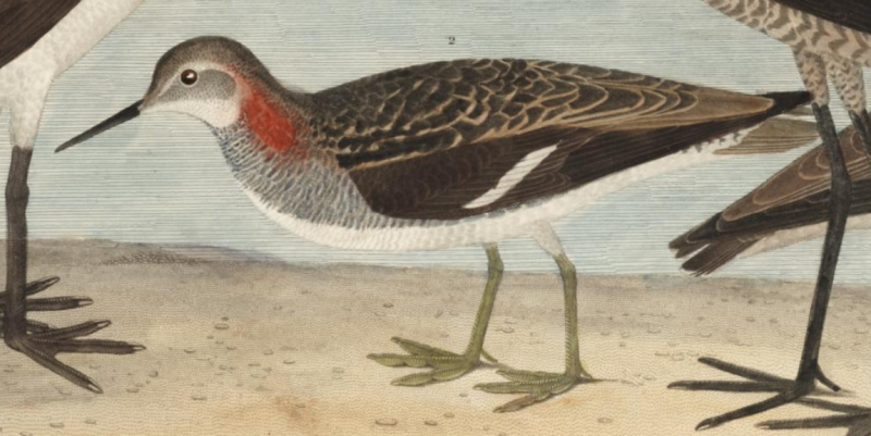 Around 1823-24, when Ord was preparing to publish a second edition of American Ornithology, of which the 9th volume (containing the phalaropes) would bear a new title, Supplement to the American ornithology of Alexander Wilson (1825), he took a copy of the original pressing (Wilson 1814) and marked it up with ink, making edits to the original copy and adding footnotes. This copy, from which many pages have been torn out, is now preserved in the Academy of Natural Sciences of Drexel University (ANSP) Archives (coll. 280); to the Editor's (MRH) knowledge, it has not been discussed in literature heretofore. This was evidently Ord's first editorial pass, because not every edit made it into the final version (i.e., the text of the Supplement..., 1825). To the original 1814 account of "Red Phalarope / Phalaropus hyperborea" (p. 75), Ord first added "-us" so that the scientific name would read "Phalaropus hyberboreus". Then, he changed his mind and replaced it with "Lobatus". He also changed the name "Red Phalarope" to "Gray Phalarope" and added a footnote, which read: "Named in the plate Red Phalarope". (ANSP Archives, coll. 280) The English name alteration (i.e., red to gray) and its explanatory footnote were included in the published Supplement (1825: 237), but the scientific name that was eventually published was "Phalaropus fulicarius", and much of the account was completely rewritten. Ord also added new details about a specimen collected by "my friend, Mr. Le Sueur" [Charles Alexandre Lesueur, 1778-1846] in Boston in 1816, and another specimen that he collected himself in Florida in 1818. / https://www.biodiversitylibrary.org/item/227703#page/243/mode/1up Ord's 1818 specimen is unlikely to have been deposited in Peale's Museum, because it was collected on an expedition sponsored by the fledgling Academy of Natural Sciences of Philadelphia, founded in 1812, which was then building the nucleus of its own collection. For more, see Thomas Peter Bennett, 2002, "The 1817 Florida Expedition of The Academy of Natural Sciences", Proceedings of the Academy of Natural Sciences of Philadelphia 152: 1-21. / https://doi.org/10.1635/0097-3157(2002)152[0001:HFTFEO]2.0.CO;2