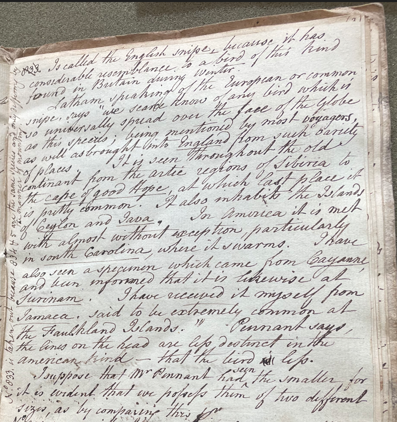 Peale wrote, in "A Walk Through the Philad[elphi]a Museum" (1805–1806) (Historical Society of Pennsylvania, coll. 0481): "Here is a snipe which is called the English Snipe, it is said to be found in every quarter of the Globe, under some trifling variety of Plumage & size. The variety which we see here belonging to America is considerable, it is a very large family."