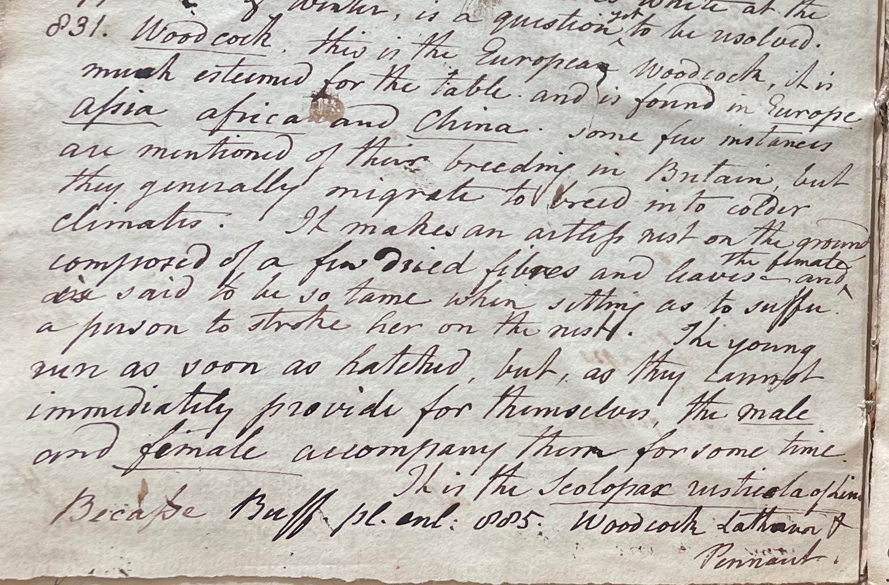 Charles Willson Peale (1741-1827) wrote, in his 26th Lecture (ca. 1799): "831. Woodcock. This is the European Woodcock; it is much esteemed for the table and is found in Europe, Assia, Africa and China. Some few instances are mentioned of their breeding in Britain, but they generally migrate to breed into colder climates. It mkes an artless nest on the ground, composed of a few dried fibres and leaves, and the female is said to be so tame when sitting as to suffer a person to strike her on the nest. The young run as soon as hatched, but, as they cannot immediately provide for themselves, the male and female accompany them for some time. It is the Scolopax rusticola of Linn. Becasse Buff. pl. enl. 885. Woodcock Latham & Pennant." (Academy of Natural Sciences of Drexel University Archives, coll. 40)