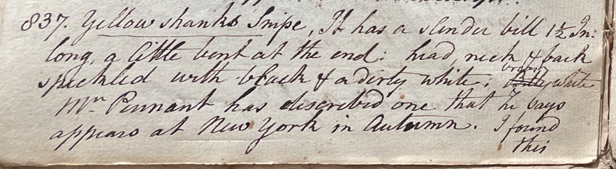 Peale wrote, in his 26th Lecture (ca. 1799): "837. Yellow shanks snipe. It has a slender bill 1 ½ [Inches] long, a little bent at the end; head, neck & back speckled with black & a dirty white; belly white. Mr. Pennant has described one that he says appears at New York in Autumn. I found this at Cape Henlopen." (Academy of Natural Sciences of Drexel University Archives, coll. 40)