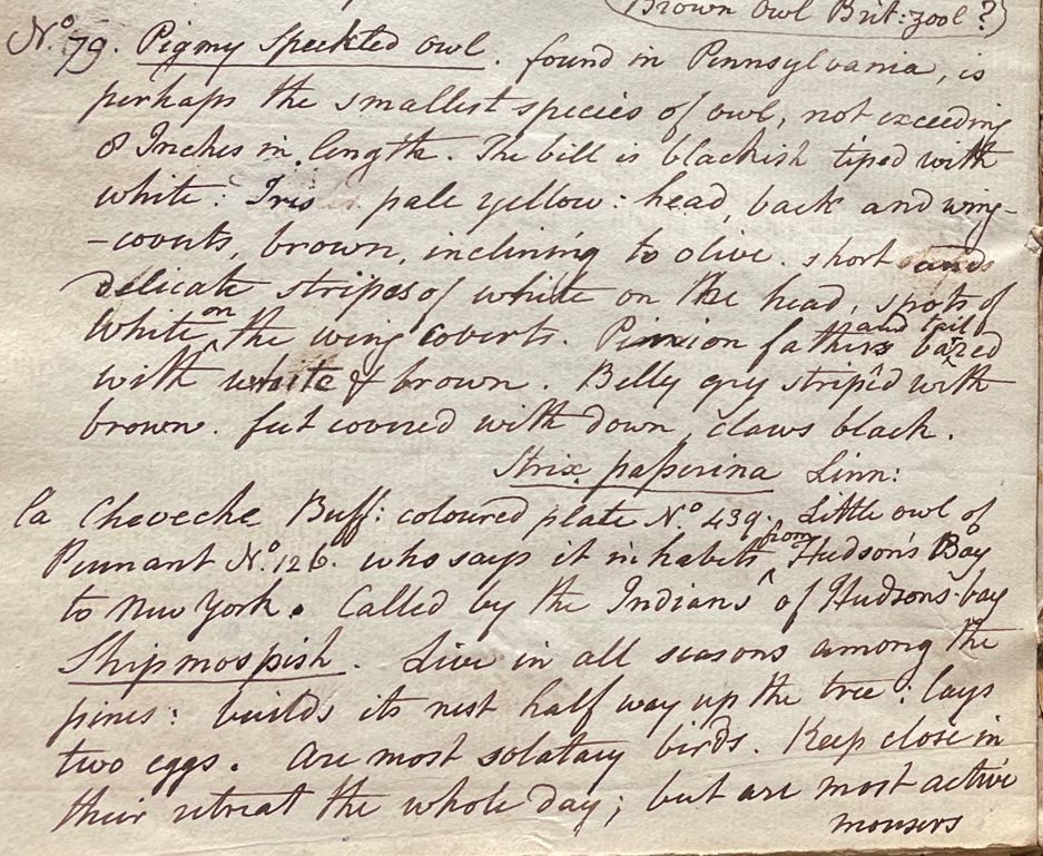 Peale wrote, in "A Walk Through the Philad[elphi]a Museum" (1805–1806): "the Pigmy speckled owl (Strix Passirena) is also said to belong to Europe & America." (Historical Society of Pennsylvania, coll. 0481)