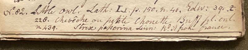 Charles Willson Peale (1741-1827) wrote, in his 14th Lecture (ca. 1799): "No. 82. Little Owl. Lath. I. p. 150. n. 41. Edw. 39. t. 228. Chevêche ou petite chouette. Buff. pl. enl. n. 439. Strix passerina Linn. Recd. from France." (Academy of Natural Sciences of Drexel University Archives, coll. 40)