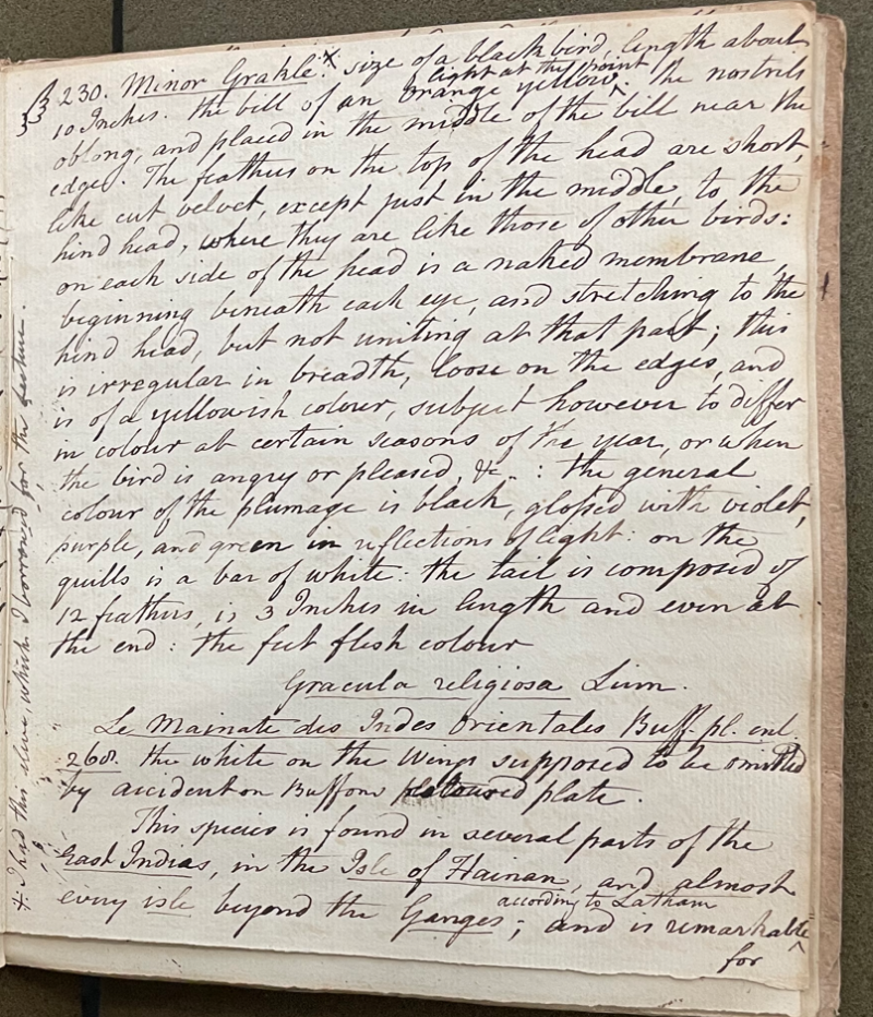 Charles Willson Peale (1741-1827) wrote, in his 17th Lecture (ca. 1799): "230. Minor Grakle. Size of a black bird, length about 10 Inches; the bill is of an orange yellow, light at the point; the nostrils oblong and placed in the middle of the bill near the edge. The feathers on the top of the head are short, like cut velvet, except just in the middle to the hind head, where they are like those of other birds; on each side of the head is a naked membrane beginning beneath each eye, and stretching to the hind head, but not uniting at that part; this is irregular in breadth, loose on the edges, and is of a yellowish colour, subject however to differ in colour at certain seasons of the year, or when the bird is angry or pleased, &c.; the general colour of the plumage is black, glossed with violet, purple, and green in reflections of light; on the quills is a bar of white; the tail is composed of 12 feathers, is 3 Inches in length and even at the end; the feet flesh colour. Gracula religiosa Linn. Le Mainate des Indes Orientales Buff. pl. enl. 268. The white on the wings supposed to be […] by accident on Buffon's coloured plate." (Academy of Natural Sciences of Drexel University Archives, coll. 40)