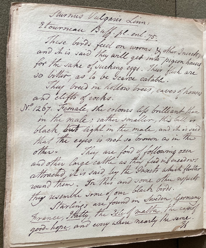 Peale wrote, in "A Walk Through the Philad[elphi]a Museum" (1805–1806): "Starling (S. Vulgaris) inhabit Europe. They are in those countries, much like what our black birds are here, their habits agreeing in many respects." (Historical Society of Pennsylvania, coll. 0481)