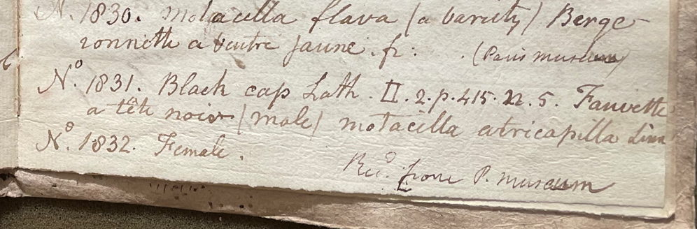 Charles Willson Peale (1741-1827) wrote, in his 36th Lecture (ca. 1799): "No. 1831. Black cap Lath. II. 2. p. 415. n. 5. Fauvette a tête noir. (male). Motacilla atricapilla Linn. No. 1832. Female. Recd. from Paris Museum." (Academy of Natural Sciences of Drexel University Archives, coll. 40)