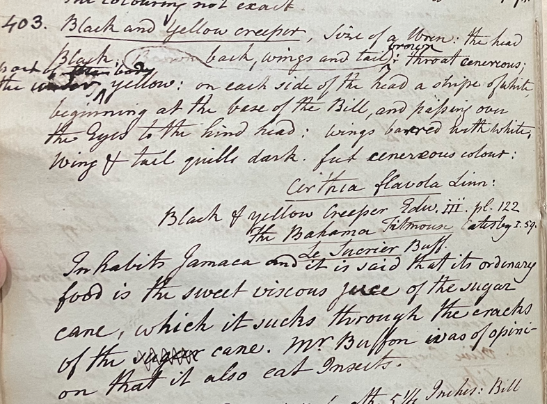 Charles Willson Peale (1741-1827) wrote, in his 20th Lecture (ca. 1799): "403. Black and Yellow Creeper. Size of a wren; the head black; back, wings and taik brown; throat cenereous; the under part of the body yellow; on each side of the head a stripe of white; beginning at the base of the Bill, and passing over the Eyes to the hind head; wings barred with white; wing & tail quills dark; feet cinereous colour. Certhia flavola Linn; Black & Yellow Creeper Edw. III. pl. 122. The Bahama Titmouse Catesby I. 59. Le Sucrier Buff. Inhabits Jamaca and is said that its ordinary food is the sweet viscous juce of the sugar cane, which it sucks through the cracks of the cane. Mr. Buffon was of opinion that it also eat Insects." (Academy of Natural Sciences of Drexel University Archives, coll. 40)