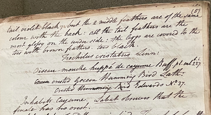 Charles Willson Peale (1741-1827) wrote, in his 20th Lecture (ca. 1799): "432. Green crested Humming bird. The length of this bird is 3 Inches; Bill black, less than 2/4 of an Inch; under the Bill is a dirty white spot; the top of the head is green, ending in a blue crest; both shining with the lustre of the finest polished metal; the upper parts of the body dark gold green; the under parts of sooty colour; the tail violet black; but the 2 middle feathers are of the same colour with the back; all the tail feathers are the most glossy on the under side; the leggs are covered with brown feathers; toes black. Trochilus cristatus Linn. Oiseau-mouche huppé de Cayenne Buff. pl. enl. 227. f. 1. Crested Green Humming Bird Lath. Crested Humming Bird Edwards No. 37. Inhabits Cayenne. Labat observes that the female has no crest." (Academy of Natural Sciences of Drexel University Archives, coll. 40)