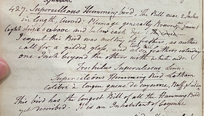 In "A Walk Through the Philad[elphi]a Museum" (1805-1806), Peale briefly mentioned "the plain dress of the supercilious Hummingbird." (Historical Society of Pennsylvania, coll. 0481)