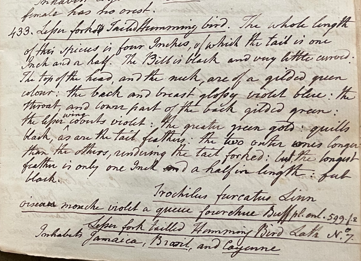 Charles Willson Peale (1741-1827) wrote, in his 20th Lecture (ca. 1799): "433. Lesser forked Tailed Humming bird. The whole length of this species is four inches, of which the tail is one inch and a half. The Bill is black and very little curved. The top of the head, and the neck, are of a gilded green colour; the back and breast glossy violet blue; the throat, and lower part of the back gilded green; the lesser wing coverts violet; the greater [coverts] green gold; quills black, as are the tail feathers; the two outer ones longer than the others, rendering the tail forked, but the longest feather is only one inch and a half in length; feet black. Trochilus furcatus Linn. Oiseau mouche violet a queue fourchue. Buff. pl. enl. 599. f. 2. Lesser Fork tailed Humming Bird Lath. No. 7. Inhabits Jamaica, Brasil, and Cayenne." (Academy of Natural Sciences of Drexel University Archives, coll. 40)