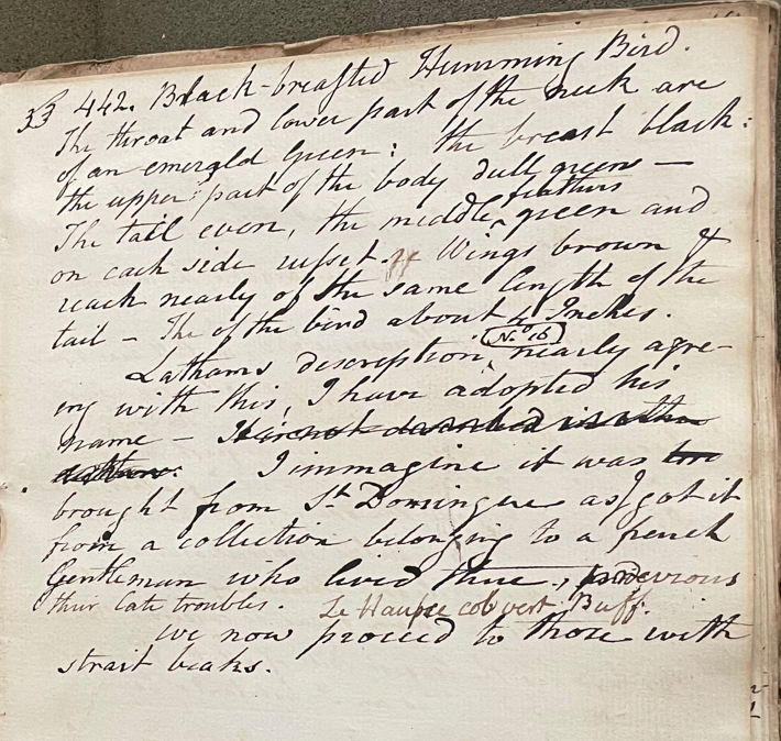 Charles Willson Peale (1741-1827) wrote, in his 20th Lecture (ca. 1799): "442. Black-breasted Humming Bird. The throat and lower part of the neck are of an emerald green; the breast black; the upper part of the body dull green. The tail even, the middle feathers green and on each sude russet. Wings brown & reach nearly of the same length of the tail. The [length] of the bird about 4 Inches. Latham's description [No. 16] nearly agreeing with this, I have adopted his name. I imagine it was brought from St. Dominque [Haiti] as I got it from a collection belonging to a French gentleman who lived there, previous [to] their late troubles. Le Haupee col vert. Buff." (Academy of Natural Sciences of Drexel University Archives, coll. 40)