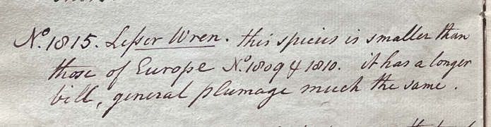 Charles Willson Peale (1741-1827) wrote, in his 36th Lecture (ca. 1799): "No. 1815. Lesser Wren. this species is smaller than those of Europe No. 1809 & 1810 [i.e., Eurasian Wren, Troglodytes troglodytes]. it has a longer bill, general plumage much the same."