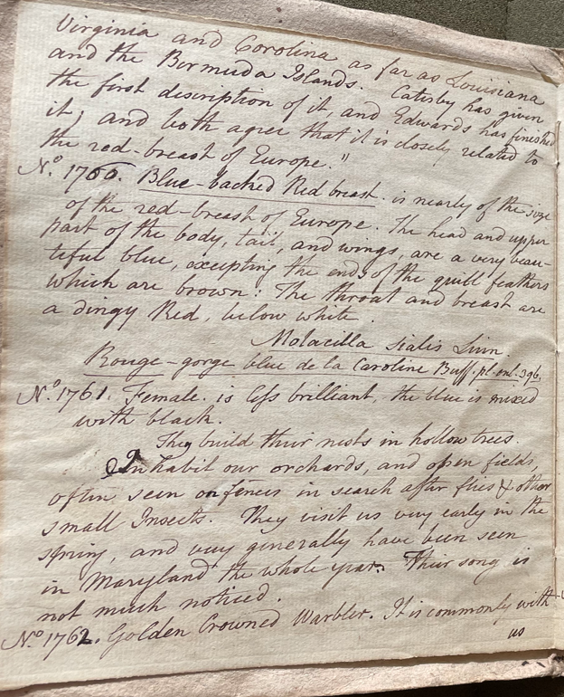 In his 36th Lecture, Peale wrote: "No. 1760. Blue-backed Red breast. is nearly of the size of the red-breast of Europe. The head and upper part of the body, tail, and wings, are a very beautiful blue, excepting the ends of the quill featehrs which are brown; the throat and breast are a dingy red; below white. Motacilla sialis Linn. Rouge-gorge blue de la Caroline Buff. pl. enl. 396. No. 1761. Female. is less brilliant the blue is mixed with black. They build their nests in hollow trees. Inhabit our orchards, and open fields, often seen on fences in search after flies & other small Insects. They visit us very early in the spring, and very generally have been seen in Maryland the whole-year. Their song is not much noticed." (Academy of Natural Sciences of Drexel University Archives, coll. 40)