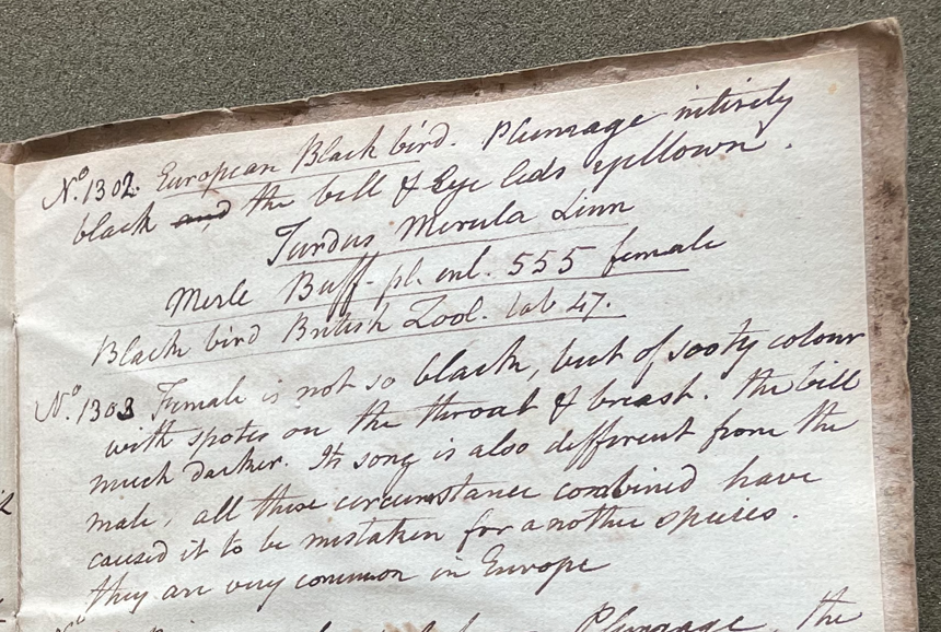 Charles Willson Peale (1741-1827) wrote, in his 31st Lecture (ca. 1799): "No. 1302. European Black bird. Plumage intirely black and the bill & Eye lids yellow. Turdus Merula Linn. Merle Buff. pl. enl. 555 female. Black bird British Zool. [lab] 47. No. 1303. Female is not so black, but of sooty colour with spotes on the throat & breast. The bill much darker. Its song is also different from the male, all these circumstances combined have caused it to be mistaken for another species. They are very common in Europe. they are very common in Europe." (Academy of Natural Sciences of Drexel University Archives, coll. 40)
