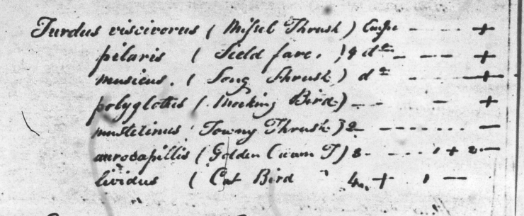 Four mounted specimens of "Turdus pilaris (Fieldfare)" from Europe were listed (APS Library, Mss.B.P31).